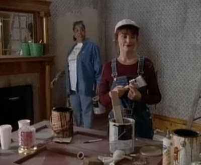 As annonced Monica (Roma Downey) renovating in good dark blue bibs with a belt. I only have checked this briefly and assume few scenes.